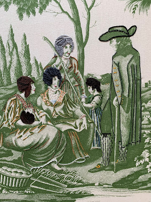 This piece is an allegory of the times we are currently living in using a preexisting wool and silk tapestry. In the original version, children push one another over and embrace in close proximity. In my version, personifications of the Corona virus, bio-mutation and mold spores collide with each other and disrupt normalcy and future plans as represented by the two figures on the right. The allegory is a rumination on time and our attempts to control it despite Nature's best efforts.